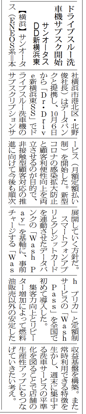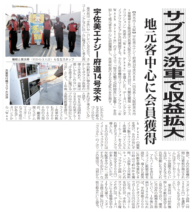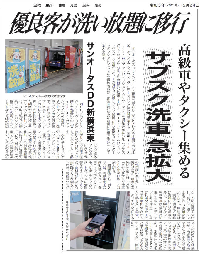 燃料油脂新聞に株式会社サンオータス様 WashPassの記事が掲載されました。