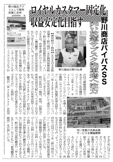 燃料油脂新聞に株式会社野川商店様 WashPassの記事が掲載されました。