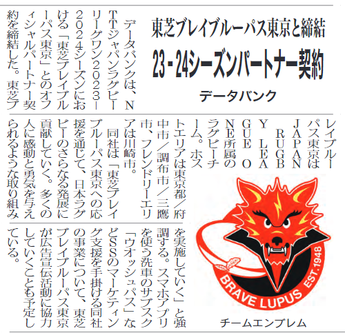 燃料油脂新聞に「東芝ブレイブルーパス東京」とオフィシャルパートナー契約を締結した記事が掲載されました。