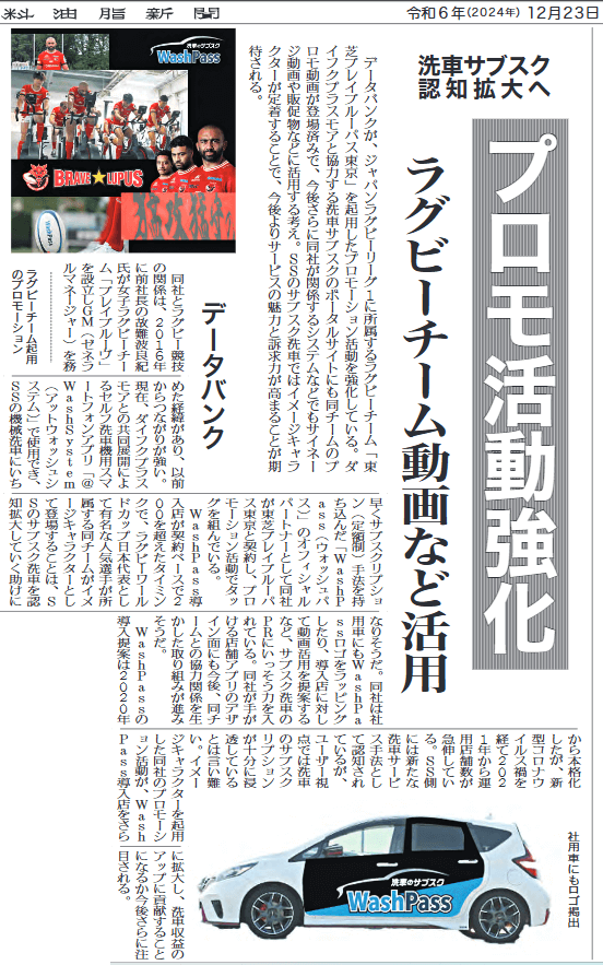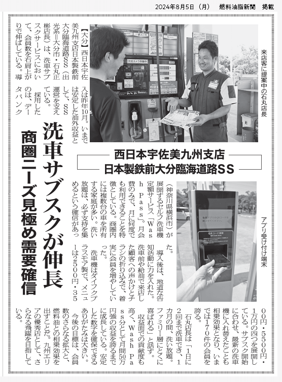 燃料油脂新聞に 株式会社西日本宇佐美 様 @Washの記事が掲載されました。